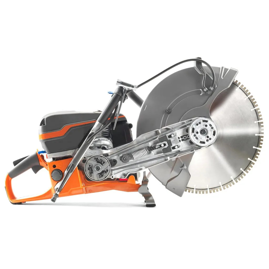 Husqvarna K 770 SmartGuard is a powerful all-round power cutter with features that make it one of the best power cutters on the market. Equipped with SmartGuard, an extended blade guard design which reduces the likelihood of accidents and circumstances when a kickback may occur as it emphasizes correct technique and correct cutting zone. The semi-automatic SmartTension system allows for optimal power transmission, minimum wear and maximum belt life. The light weight, outstanding power-to-weight ratio, the reliable start and exceptionally low vibrations mean less strain and maximized productivity. Suitable for road work and easy to cut in a straight or curved track or close to sidewalk when used with KV7 trolley.