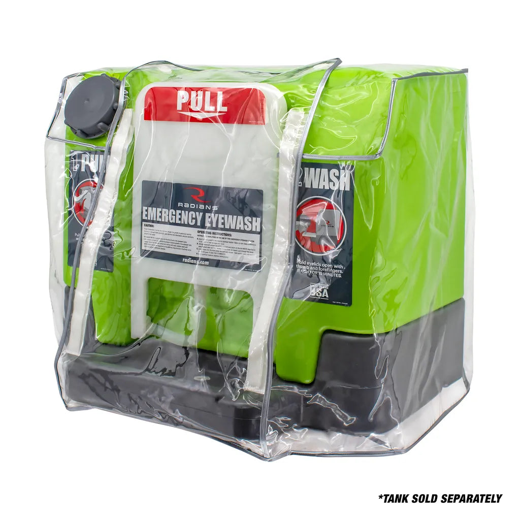 Radians REWCOVER12 provides your eyewash system with even more protection. This custom-fit cover will keep dust from reaching critical operation points and infiltrating water. This allows you to be confident that contaminants have not entered in your REW01112. Made from a clear UV resistant plastic with reinforced seams it is very durable and due to its visibility through the cover you wonÂ’t have to remove it to check the fill level or to add water. The final piece is the hook and loop closure. It provides the capability to use one hand to pull down the manifold deployment as ANSI requires.